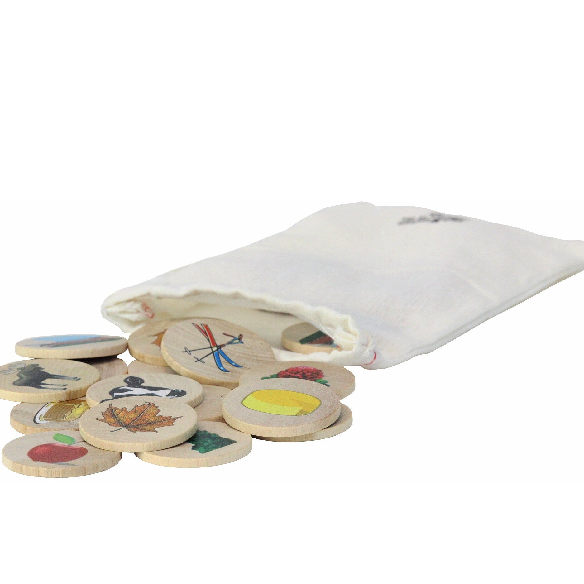 This charming game includes 20 Vermont-themed 1.5" diameter rounds (10 pairs). Each pair features food, buildings, animals, and more iconic Vermont items. Rounds are unfinished and printed with non-toxic ink. Game includes a cloth bag.