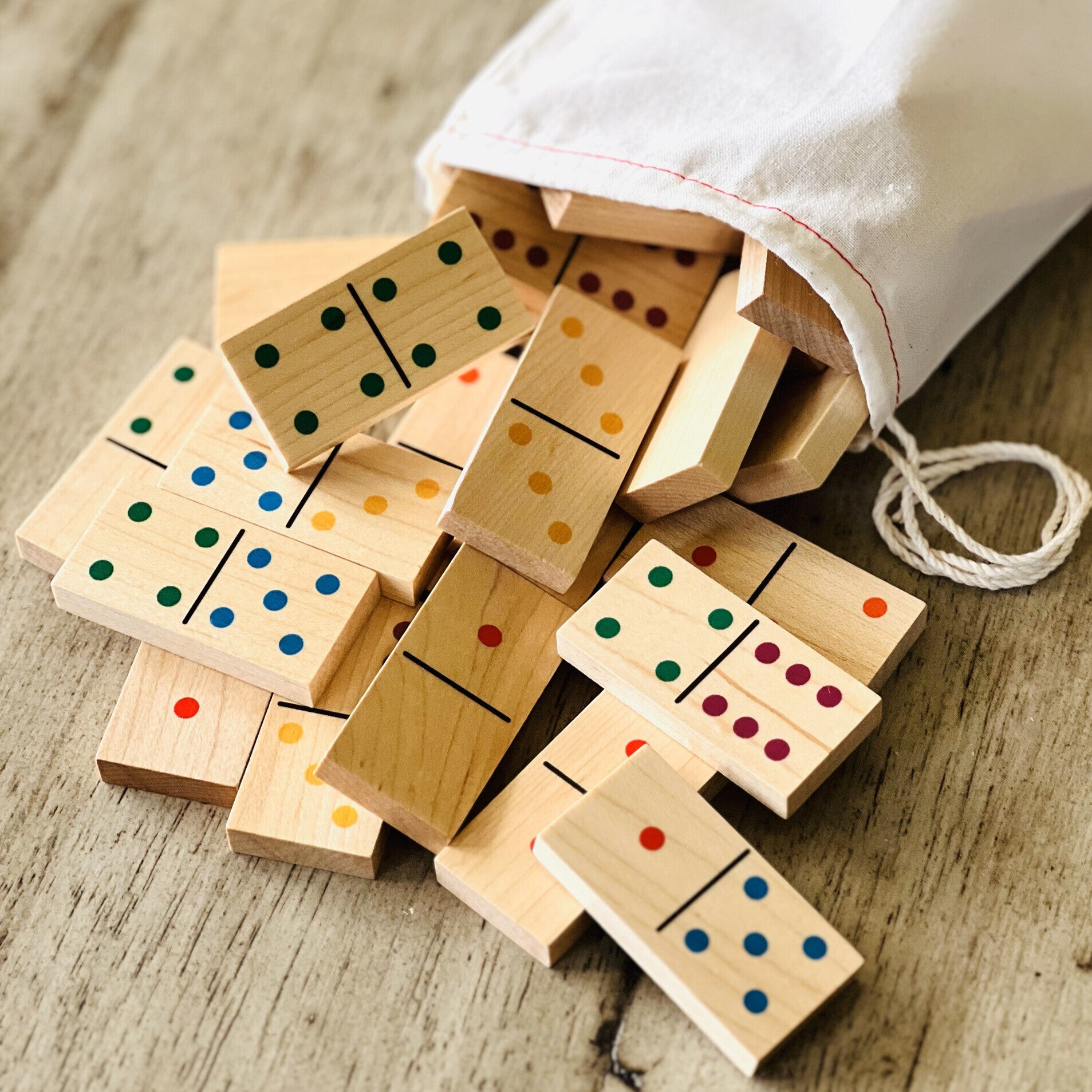 This set comes with playing instructions and shrink wrapped with a drawstring bag. A double six set with colorful dots. Crafted from locally harvested hardwood maple, each domino measures about 1.25" wide, 2.5" long and about 0.5" thick. There are 28 dominoes per set.
